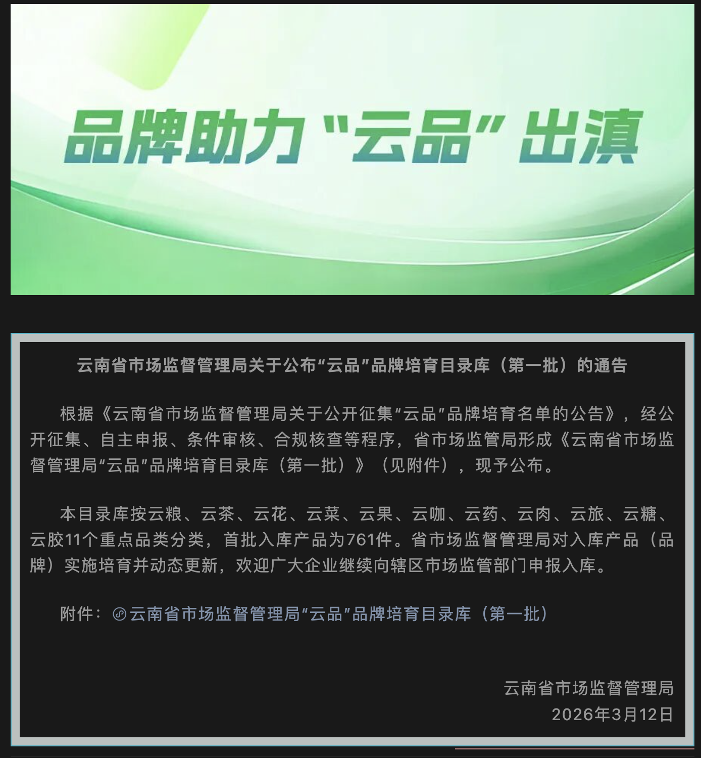 《云南省市场监督管理局关于公布“云品”品牌培育目录库(第一批)》