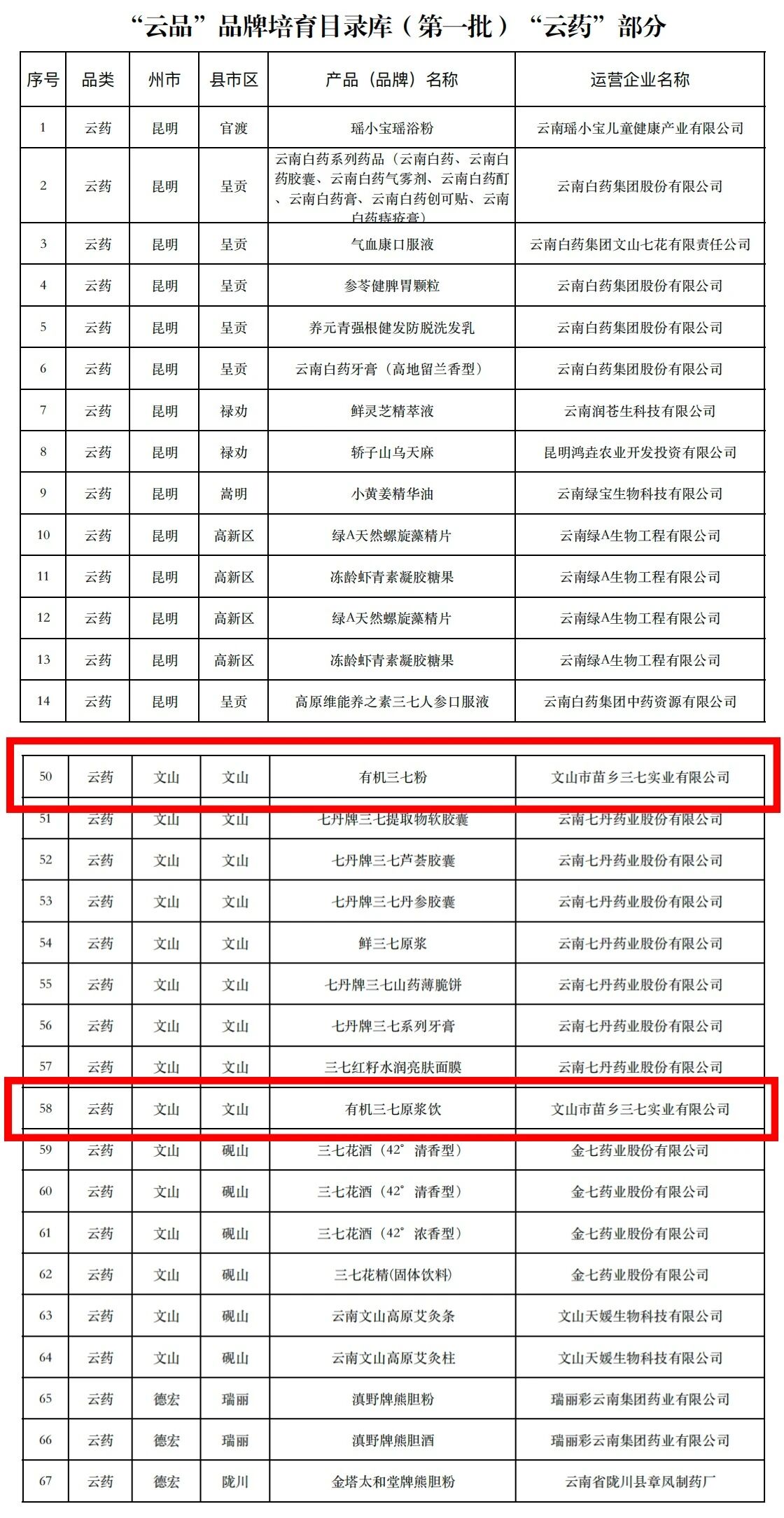 《云南省市场监督管理局“云品”品牌培育目录库(第一批)》公布!全省首批761件,涵盖11大品类,苗乡三七携“有机三七粉”及“有机三七原浆饮”强势入选!为“云药”崛起增砖添瓦。